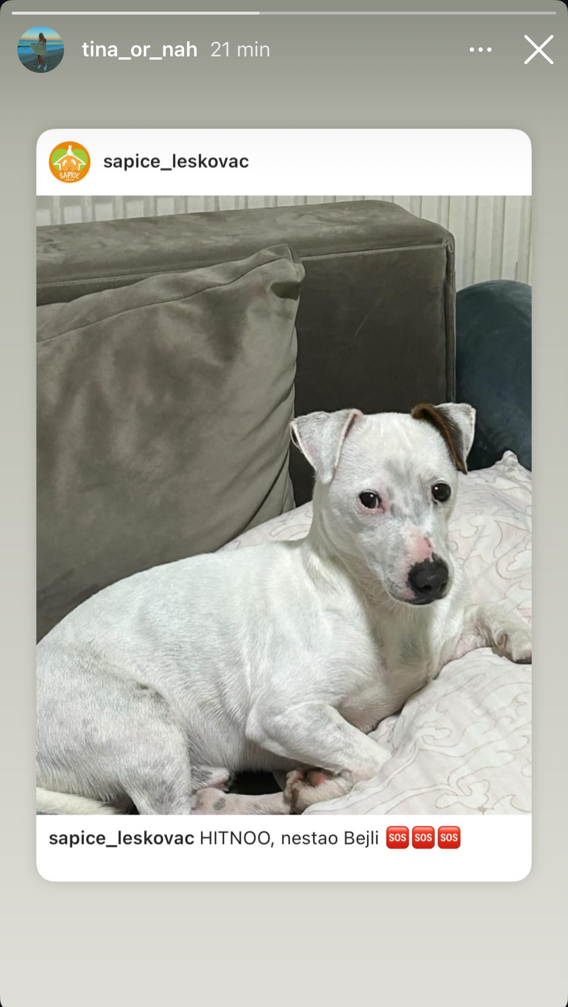 Bele je boje, ima braon šaru na levom uvetu. Nije navikao na ulicu, ne ume da se snadje i vrati kući. Postoji mogućnost da je psa neko uzeo, ne znajući da pas ima vlasnike! Molimo za svaku informaciju!