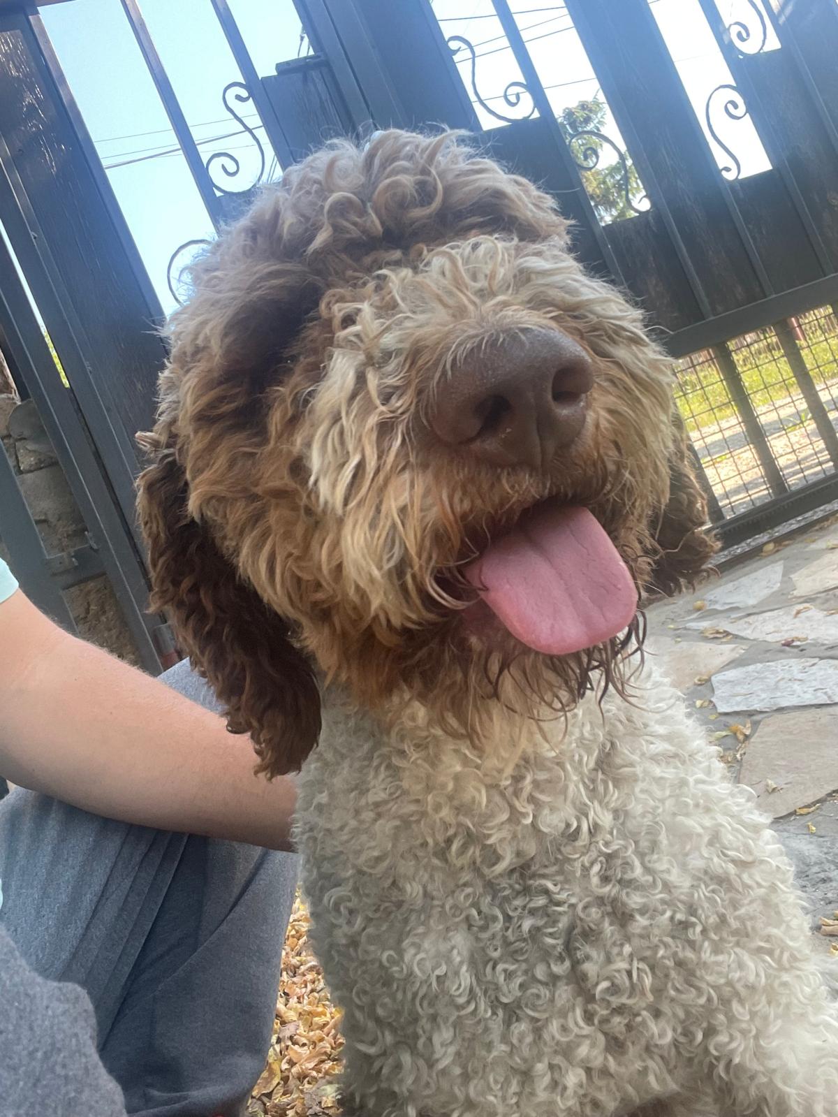 Umiljat, voli decu, glava mu je prekrivena braon kovrdžavom dlakom, telo većim delom bela dlaka. Star 2 god.