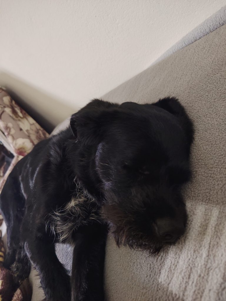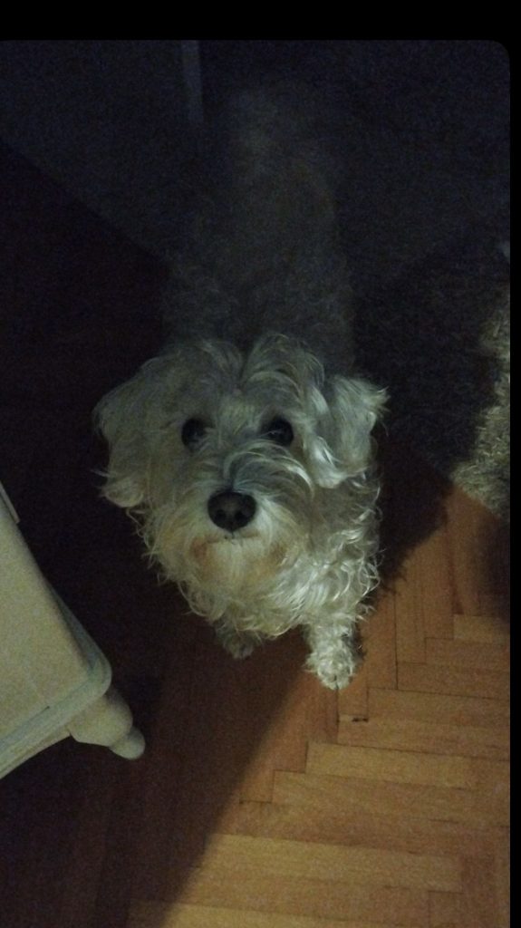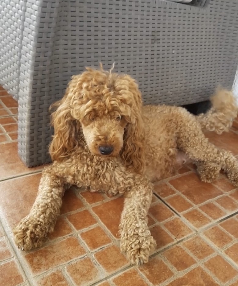 Umiljat, voli decu, glava mu je prekrivena braon kovrdžavom dlakom, telo većim delom bela dlaka. Star 2 god.