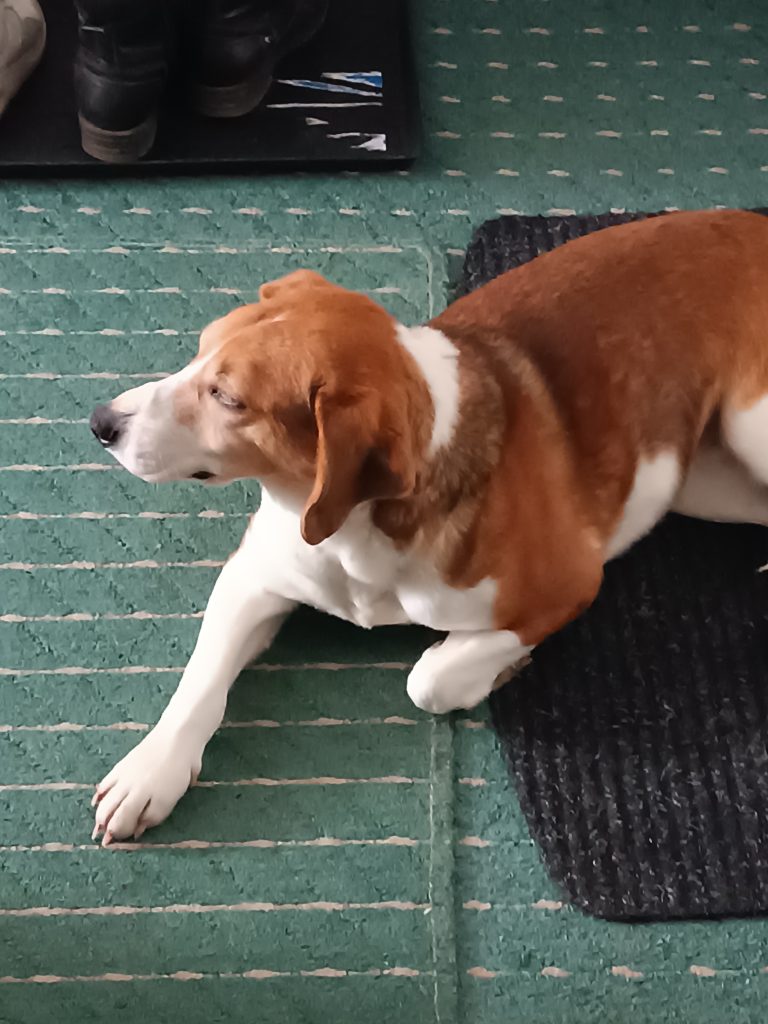 Mlad pas oko 2 godine. Imao je prelom prednje leve sape i vidno je kriva, fali mu pola repa. Skroz beo