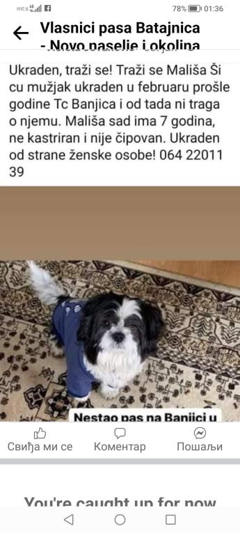 MališaОд: / RasaŠi cuPolMuškiVeličinaMaliBojaCrno-belaČipNemaDatum24/02/2023LokacijaBanjica opis Ukraden na Banjici Tc ulaz u maksi, 24.2.2023.Ši cu muzjak tada star 6 godina. Nije cipovan. Vet. Danijela Glogovac vlasnik Violeta Jovanović+381642201139jovanovicvioleta997@mail.com